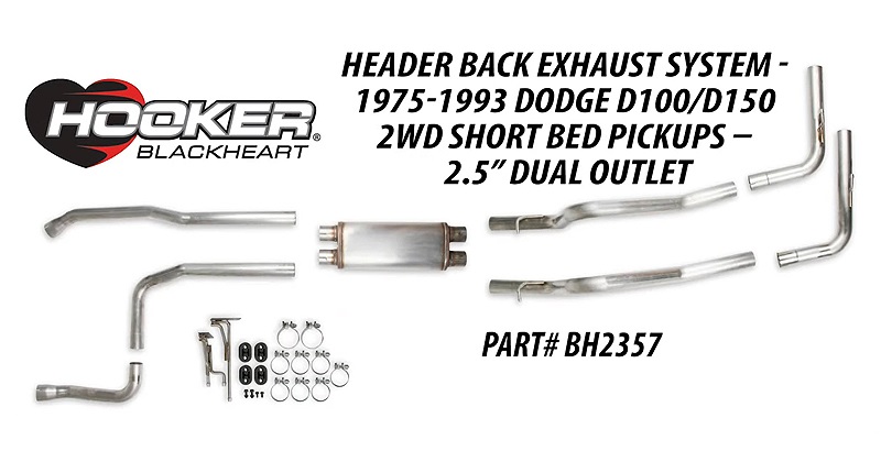 Finish off your HEMI Swap project with a high-quality exhaust system for the 1972-1993 Dodge D100/D150 2WD short bed two-wheel-drive pickup. They are available in either 3” single outlet, or 2.5” dual outlet options, with a straight-through 409 stainless-steel muffler and 409 stainless-steel mandrel-bent exhaust tubing. They are specifically designed to be used in conjunction with Hooker BlackHeart BH2355 or BH2366 mid-length headers. This exhaust system is designed for optimized component clearances when used with the entire swap system for the D100/D150 platform. The system features a passenger-side exhaust outlet, ending just behind the rear tire.